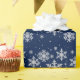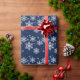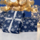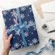 Elegantes Feiertagsverpackungspapier getan in dunkelblauem, mit Grafiken der silbernen Glitterschneeflocken. Großes Weihnachtspapier mit heraus der Glitterverwirrung. Fertigen Sie besonders an, um Ihren eigenen Text zu addieren.