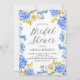 Mit dieser strahlend blauen Brautdusche laden wir Sie zu Ihrer Veranstaltung ein. Es verfügt über einen blühenden Aquarellrahmen aus blauen und weißen Hydrangeas, vergessenen Noten und Anemonen. Die blauen Hydrangeas laden zu Frühlings- und Winter-Brautpartys ein. Personalisieren Sie diese durch Hinzufügen von Namen, Datum, Uhrzeit, Ort und anderen Details.