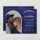Ein Foto Save the Date Karte für Ihre Hochzeit Fügen Sie Ihre eigene vertikale Größe Foto. Imitate goldenes Foto Bogen Rahmen. Ein marineblauer blauer Hintergrund, weißer Text. Die blaue Farbe ist ungleichmäßig. Personalisieren Sie Ihre Namen und das Datum und fügen Sie sie hinzu.