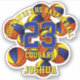 Der Basketball-Aufkleber in Mannschaftsfarben zeigt das Bild eines Haufens von Basketballbällen unterschiedlicher Größe, auf dem man den Namen des Athleten, die Trikotnummer, den Teamnamen und den Maskottennamen - jeder Basketball hat zwei farbige Panels, eines blau und eines gold - von katz_d_zynes