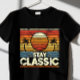 Hier ist ein Retro-Vintages, wiederbelebtes T - Shirt-Design mit einem klassischen Sonnenuntergang mit geschichteten Streifen, Palmen und einer bedrückten Textur, zusammen mit dem Satz "Klassisch Bleibe" 🌅 🌴 ✨