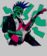 Ein robotisches Skelett mit einem blauen Punk-Mohawk spielt eine leuchtend rosa E-Gitarre, die beim Spielen elektrische Energiewellen abgibt. Der Roboter trägt eine schwarze Lederjacke.