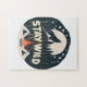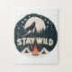Ein Wolf steht zum Schweigen und heult gegen einen Vollmond, umgeben von einem Wald und einem Lagerfeuer zwischen zwei Zelten. Die Worte "Bleibe Wild" werden prominent angezeigt und unterstreichen ein Gefühl von Abenteuer und Natur.