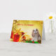 Cavalier King Charles Spaniel Weihnachtskarte Dies ist eine bezaubernde Weihnachtskarte mit Geschenken und goldenen Sternen mit einem Original Foto eines Blenheim Cavalier König Charles Spaniel sitzend mit einem Haufen Geschenke. Der goldene Hintergrund hat Sterne und eine rote Geschenkboxen.