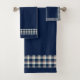 Ces serviettes sont conçues dans un bleu foncé avec une bordure en plaid d'un bleu assorti et d'un blanc crémeux. Elles sont conçues pour se coordonner avec les autres produits de la salle de bains du même titre (rideaux de douche, tapis de bain et accessoires de bain).