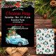 Venez à une FÊTE - Noël ! Une camionnette amusante bleu aquarelle, remplie de cadeaux enveloppés de gaieté et un arbre à feuillage persistant roule au fond de cette invitation qui comporte un arrière - plan noir et un texte rouge et blanc. Le dessus de la carte est orné d'une bordure de feuillage saisonnier : poinsettia, baies et "Cloches d'argent", le tout entouré de lumières blanches. Les informations sur l'invitation sont en caractères blancs simples, à l'exception de "Christmas Party" et les noms des hôtes dans un script rouge. Le texte est en deux polices, une petite police distincte et une police de script. Il est simple de substituer les détails de votre partie à nos substituants. Il suffit de cliquer sur "Personnaliser" pour commencer. Le dos de la carte est rempli avec le camion bleu d'un autre angle et décorations saisonnières, le tout en aquarelle.