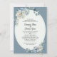 Elégant Christian Dusty Blue Watercolor Floral Oval Faire-part de mariage encadrée avec une police de script simple et des accents cardiaques.