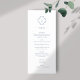 Chic et élégance jeune. Cette carte de menu mariage bleu et blanc poussiéreux dégage une tonalité fraîche, moderne et jeune. L'avant de la carte comprend un ensemble de polices contemporaines en monogramme bleu poussiéreux et élégant couple floral, contre un arrière - plan blanc immaculé. Le monogramme de couple est répété à l'arrière.
