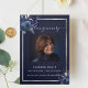 Un programme triplé élégant. Un arrière - plan bleu marine, un cadre faux argenté, des fleurs bleues et un espace pour une photo. Personnalisez et ajoutez le nom, les dates et votre texte.