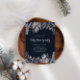 Illustration du feuillage d'hiver sur le dessus et le bas dans les tons gris et bleu associée à un script blanc pour toutes vos informations sur un arrière - plan bleu foncé. Consultez notre magasin pour plus d'options d'invitation à Noël.