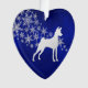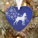 Ce joli ornement de Noël fera un merveilleux cadeau de souvenir pour quiconque aime un Basenji! Il présente une silhouette argentée de Basenji image de chien devant un spray de flocons de neige argentés ornés. L'image est placée sur un arrière - plan bleu profond dégradé. L'arrière de l'ornement a le même arrière - plan bleu et des flocons de neige, et un champ de texte pour vous de customiser.