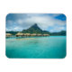 Der rechteckige Andenken-Foto-Magnet mit einem luxuriösen Bungalow-Resort aus überwasser-gedecktem Dach in einem Ferienort in der blauen Lagune mit Blick auf die tropische Insel Bora Bora, in der Nähe von Tahiti, in Französisch-Polynesien.