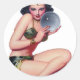 Vintages Button-Up-Bild aus einem klassischen Zeitalter. Ein lustiges, sassy Bild einer Retro-Pinup-Pose. Die Frau posiert mit ihrer Kristallkugel.