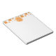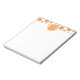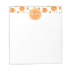 Un bloc-notes blanc avec une bordure de pêches souriantes avec des feuilles verts. En haut se trouve une combinaison nom et monogramme qui peut être customisée. Le pavé est en grande partie vide et offre beaucoup d'espace pour l'écriture.