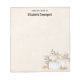 Un bloc-notes avec des citrouilles blancs d'aquarelle fantaisie aux accents de parties scintillant en faux or. Entouré de feuilles verts et de fleurs sauvages roses.