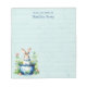 Joli bloc-notes avec mignon lapin assis dans un pot plante avec des fleurs dans un style aquarelle. Le bois rustique, arrière - plan vert sauge est parfait pour écrire des notes. Tout le texte peut être personnalisé.