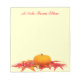 5,5" x 6" bloc - notes jaune pâle personnalisable avec une image d'un citrouille orange sur un lit du rouge et du feuille d'automne d'or. Voyez la collection entière de bloc - notes de thanksgiving dans la section de VACANCES.
