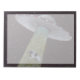 Un dessin au crayon couleur d'une vache malheureuse enlevée par des aliens dans une soucoupe volante, une nuit sombre et étoilée. Le troupeau effrayé s'agite dans l'arrière - plan.