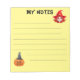 Un bloc-notes jaune clair avec des lignes verticales noires et deux illustrations : un portrait d'une mignonne sorcière en haut à droite et un citrouille portant une tête de sorcière en bas à gauche. En haut, il est écrit "Mes Notes" - des mots qui peuvent être facilement remplacés à votre goût.