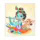 Krishna the Holy Indian God playing flute illustration sitting next to a cow with jasmine garlands, peacock feather and bird composed art.