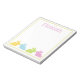 Ce mignon bloc-notes comporte d'adorables lapins lapins lapins dans des tons doux de rose, bleu, vert et jaune sur le blanc massif. Personnalisez avec votre choix de nom ou de texte spécial en rose correspondant. Fait de grandes fêtes pour Pâques ou n'importe quelle période de l'année!