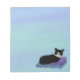 Illustration graphique d'un chat noir et blanc faisant la sieste sur des oreillers à jetons colorés.