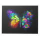Arc en ciel, papillon monarque lumineux, artistiquement peint avec bouquet de roses irisés, lumineux, lumineux sur arrière - plan noir. Papillon arc-en-ciel.