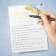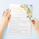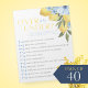 Bloc-notes pour pack de jeux avec citron sur ou sous douche. Comprend 40 draps faciles à déchirer. Demandez à vos invités si les déclarations sont terminées, sous ou correctes en encerclant leur réponse. Avec de beaux citrons jaunes aquarelles et des fleurs florales bleues. Une partie de notre collection principale de douches nuptiales. Découvrez d'autres jeux correspondants dans la boutique maintenant!