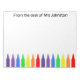 Conçu pour un enseignant, ce bloc-notes coloré et utile peut être personnalisé avec n'importe quel nom. Il y a une rangée de crayons de cire aux couleurs vives le long du fond, et en haut les mots : Du bureau de [votre nom]. L'arrière - plan est blanc pour la lecture facile des notes.