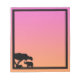 Bloc-notes de 5,5 po x 6 po avec une image de silhouettes de deux éléphants africains et un arbre au coucher du soleil avec une bordure noire. Voir l'ensemble de la collection Safari Notepad dans les TOUCHES SPÉCIALES | Section Favoris.