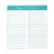 Simple Moderne Élégant Turquoise Lined Personnalisé Liste de contrôle à deux colonnes Bloc-notes Ces blocs-notes personnalisables sont simples pour une utilisation quotidienne ou l'envoi d'une note formelle à quelqu'un de votre bureau ou bureau à domicile. Vous pouvez également choisir une variété de couleurs dans notre boutique pour vos besoins de bureau à domicile. Personnalisez ces blocs-notes avec votre nom ou donnez comme cadeau et personnaliser avec vos amis ou les noms de famille afin qu'ils puissent les utiliser à leur domicile ou au bureau.