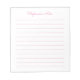 Bloc-notes personnalisé Ces blocs-notes personnalisables sont simples à utiliser tous les jours ou à envoyer une note formelle à quelqu'un de votre bureau ou bureau. Vous pouvez également choisir une variété de couleurs dans notre boutique pour vos besoins de bureau à domicile. Personnalisez ces blocs-notes avec votre nom ou donnez comme cadeau et personnaliser avec vos amis ou les noms de famille afin qu'ils puissent les utiliser à leur domicile ou au bureau.