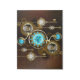 Turquoise lenses with antique watch with brass gears and golden keys on rusty, brown background. Steampunk style.