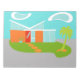 Ce Cartoon House moderne du milieu du siècle vous donnera envie de sortir le tapis WELCOME et de vous faire à la maison! Dans les années 1960, le design minimaliste de l'art se compose d'une élégante maison en pierre orange et en verre d'eau sur une pelouse verdoyante et verdoyante en forme de boomerang. La pelouse forme une oasis au milieu de son environnement gris et bétonné. Un palmier vert se balance dans la brise. Quatre pierres de pas orange mènent à la porte d'entrée rétro, rouge, avec trois vitres rectangulaires en verre. A gauche de la porte, un fleerpot turquoise abrite une plante tropicale et verte. La maison a un toit blanc en V incliné qui pointe vers deux nuages blancs en forme de haricot. Le ciel est une ombre d'aqua positivement sereine. Personne ne voudra jeter des pierres de ce design moderne de maison en verre ! Achetez ce produit kitschy, space age et soyez le chat le plus cool de votre bloc !