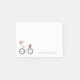 Joli bloc-notes de post-it fait dans le blanc, avec des graphiques d'une pêche et d'un vélo de la dame verte, avec un panier des fleurs et des ballons, décorant le fond de la protection. Le texte vert fait sur commande est prêt à personnaliser.