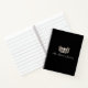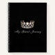 Ce bloc-notes en spirale est montré en noir élégant avec une impression d'une couronne argentée brillante sur la couverture et a aligné la règle du collège à l'intérieur. Sous la couronne se trouvent les exemples de mots de "Mon voyage spécial" dans un script sophistiqué qui vous attend pour personnaliser votre thème. Couverture arrière en couleur solide de noir avec une petite couronne argentée au fond.