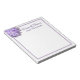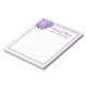 Bloc-notes 5x6 avec design de fleur lavande hydrangée. Customisez deux lignes de texte en haut avec le nom commercial et l'emplacement, ou tout libellé. Le papier blanc est bordé de lignes fines en dégradé violet.