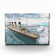 Bateau titanique célèbre flottant parmi des icebergs sur l'eau par jour nuageux