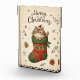 A festive illustration features a cute tabby cat wearing a Santa hat, nestled inside a green and red Christmas stocking. The stocking is decorated with traditional patterns. Above the cat, the words "Merry Christmas" are written in a decorative script. The background is a soft beige color, adorned with stars, dots, and sprigs of greenery.