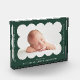 Bloc photo simple et moderne avec la photo de votre bébé niché à l'intérieur d'un cadre vert de la forêt. Personnalisez le bloc photo en ajoutant le nom de votre bébé et des informations supplémentaires en lettres blanches.