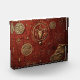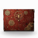 Un emblème orné brille en or sur un fond cramoisi texturé, entouré de symboles ésotériques et d'inscriptions cryptiques.