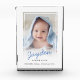 Bloc moderne de photo de souvenir de naissance de bébé. Ajoutez votre photo dans le cadre blanc élégant. Le prénom de votre enfant peut être ajouté dans la police bleue de manuscrit. Le milieu de l'enfant et le nom de famille et les stat de naissance suivent. Conception élégante et simple.