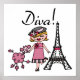 Diva-T - Shirt, Karosseriebücher, Tasse, Taschen, Karten, Aufkleber, Schlüsselketten, Kissen, Wanduhren und vieles mehr mit einem niedlichen Diva-Design, das ein blondes, haariges Mädchen in einem Hut und rosa Kleid mit ihrem rosa Poodle in der Nähe des Eiffelturms zeigt!