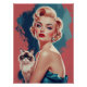 Diese faszinierende Abbildung zeigt eine glamouröse Figur mit blonden Haaren, die in eleganten, Vintag inspirierten Glockenbögen gestaltet ist, die an das goldene Zeitalter Hollywoods erinnern. Sie ist mit einer zarten Perlenhalskette und glänzenden Ohrringen geschmückt, die ihrem Aussehen eine Touch Raffinesse verleihen. Ihr strapazierfähiges türkisfarbenes Kleid mit seinem subtilen Schimmer und seinem strukturierten Design unterstreicht ihre gediegene Eleganz. In ihren Armen liegt eine flauschige Katze mit einem unverwechselbaren schwarz-weißen Mantel und einem komisch gruseligen Ausdruck, deren grüne Augen einen spielerischen Kontrast zur raffinierten Schönheit ihres Begleiters schaffen. Der Hintergrund ist eine feine Mischung aus aquamarinen und korallenfarbenen Farbtönen, mit abstrakten Pinselstrichen, die einen dynamischen, modernen Kontrast zur klassischen Button-up Ästhetik schaffen. Dieses Kunstwerk verbindet wunderbar Vintagen Glamour mit einer skurrilen Touch, was es zu einem charmanten Werk für diejenigen macht, die eine Mischung aus Eleganz und Spaß in ihrer Kunst Liebe.