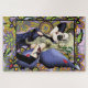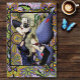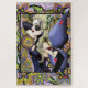 Blonde Fee mit lila und roter Farbe in einem geometrischen Blumenmuster aus Grün, Ornament, Lavendel und Rosa,