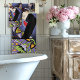 Fée blonde en violet et rouge dans un motif géométrique floral de vert, orange, lavande et rose