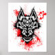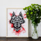 Das Bild zeigt einen wilden Wolfskopf in Schwarz und Weiß, Set vor einem blutüberfluteten Hintergrund. Die Augen des Wolfs leuchten, und seine Zähne werden in einer bedrohlichen Schnecke gebacken. Die allgemeine Stimmung des Bildes ist aggressiv und intensiv.