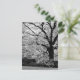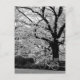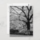 Ein Schwarz-Weiß-Foto eines Fahrrads, das vor einem großen Kirschbaum in Blüte auf einer Straße in Tokio, Japan geparkt wurde.