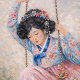 A young woman in a flowing Korean hanbok gently swings beneath blooming spring trees, caught in a moment between memory and dream.