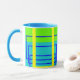 Cette jolie tasse lumineuse présente mon art graphique original de lignes et de formes dans les tons bleu, jaune et vert. De style abstrait, il rappelle l'époque rétro mondrienne de l'art. L'intérieur et la poignée ont une tonalité harmonieuse de bleu aqua. Ce sont des tasses de 11 onces, juste la taille idéale pour votre café ou thé maison - ou même du chocolat chaud! Cela ferait un grand cadeau, et vous pouvez mettre des paquets de café, des sacs de thé ou du chocolat chaud à l'intérieur. Une autre idée de cadeau est de mettre un petit plante dedans pour le rendre spécial